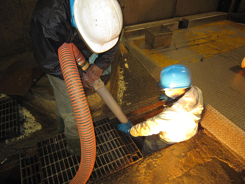 ゴミ収集車で集められた一般ゴミを処分する工場内の排水詰り修繕です。パッカー車(ゴミ収集車)がゴミを空けるときに出る汚水を排水する為の配管です。